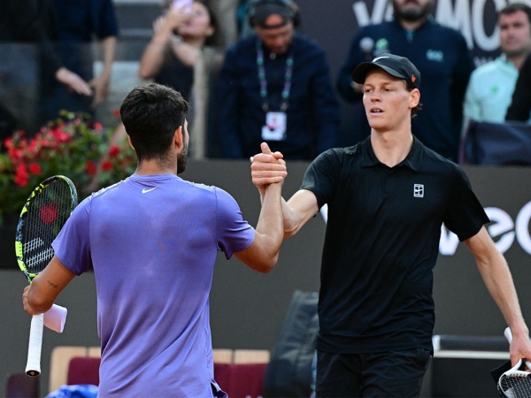 Jannik Sinner (R) shakes hands with Carlos Alcaraz after Alcaraz won their Rome Masters final. [Getty Images]